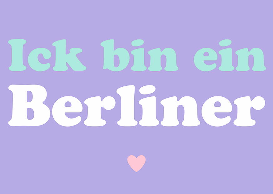 Auf einem lila Hintergrund steht in verschiedenen Schriftarten der Satz Ick bin ein Berliner. Diese farbenfrohe Gestaltung ist ideal für kreative Zwecke und die Identifikation mit Berlin.