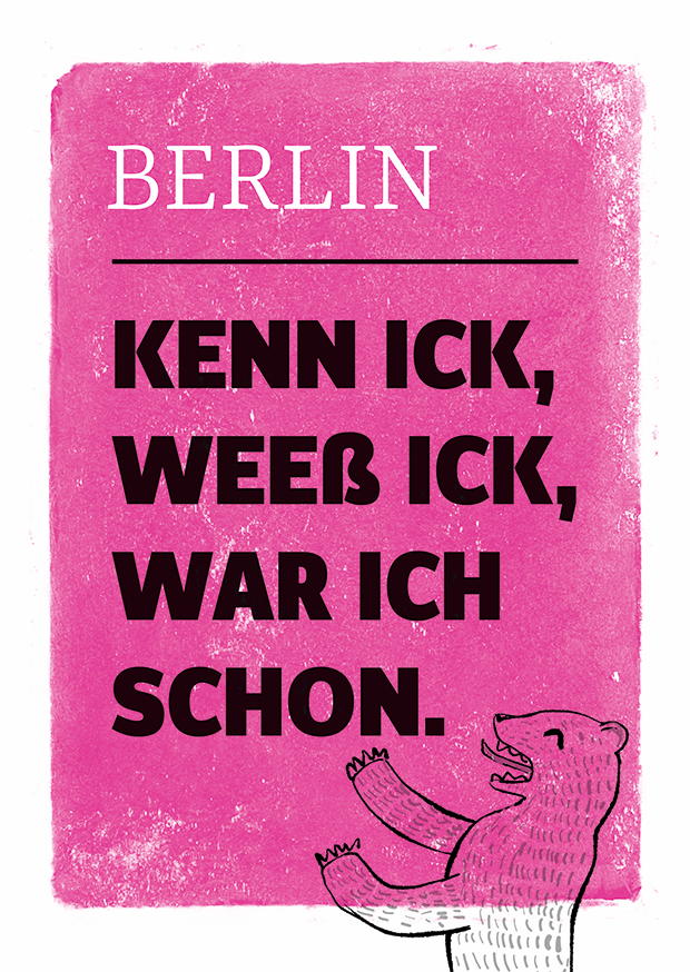 Ein farbenfrohes Poster mit einem lustigen Spruch über das Leben in Berlin und einem stilisierten Bären, das die lokale Kultur widerspiegelt.