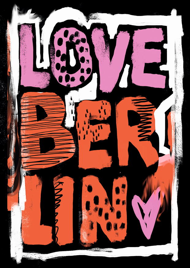 Eine Kunstinstallation in Berlin präsentiert den Schriftzug Liebe Berlin in lebendigen Farben. Die Verwendung von verschiedenen Schriftarten sorgt für eine bemerkenswerte visuelle Wirkung.
