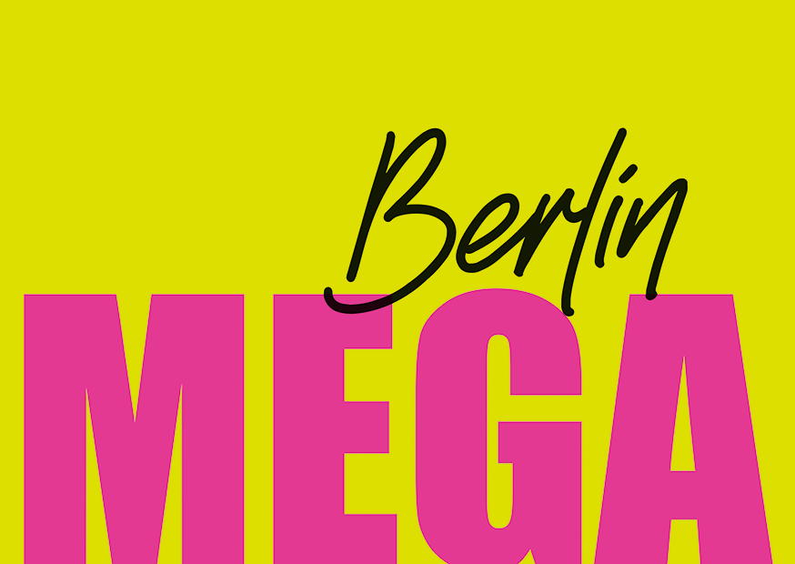 Buntes Grafikdesign mit dem Wort Mega und dem Standort Berlin auf lebhaftem Hintergrund. Perfekt für Werbung und Events in der Stadt.