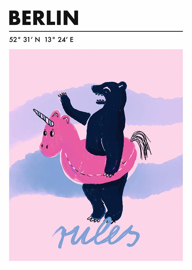 Diese farbenfrohe Illustration zeigt einen Bären, der auf einem rosa Einhorn sitzt, umgeben von sanften Pastellfarben. Ein Ausdruck von Spaß und Fantasie.