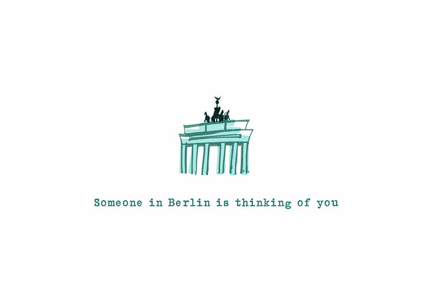 Das Design zeigt das Brandenburger Tor in Berlin in einer minimalistischen Darstellung mit der Botschaft, dass jemand an dich denkt. Eine kreative und herzliche Geste.