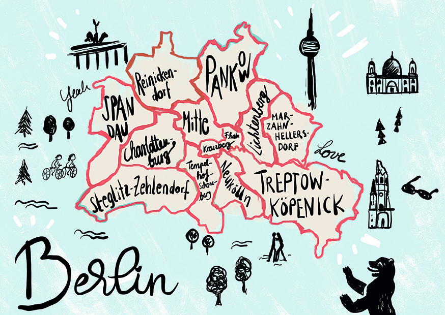 Eine kreative Darstellung der Berliner Stadtteile mit markanten Sehenswürdigkeiten, die auf einem hellen Hintergrund skizziert sind und die Vielfalt der Hauptstadt zeigen.