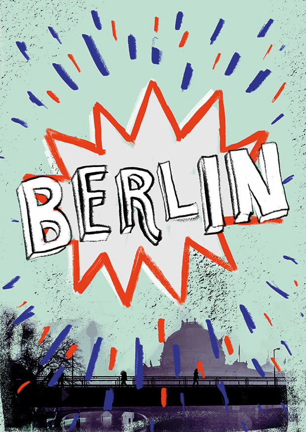 Die bunte Darstellung zeigt den Schriftzug Berlin vor einem kreativen Hintergrund mit grafischen Elementen, die die lebendige Atmosphäre der Stadt einfangen.