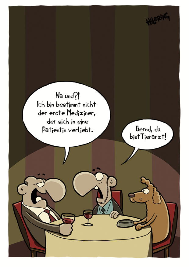 Zwei Ärzte und ein Hund diskutieren am Tisch über eine amüsante Situation, während sie ein Abendessen in einem Restaurant genießen.