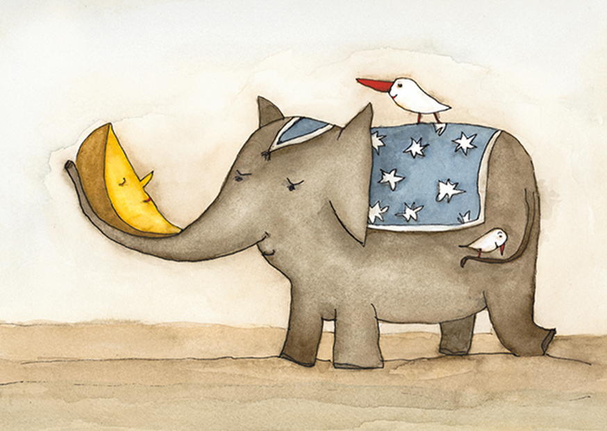 Der Elefant trägt einen gelben Mond auf seinem Rüssel, während Vögel auf seinem Rücken sitzen und die ruhige Umgebung genießen. Eine kreative und zauberhafte Darstellung.