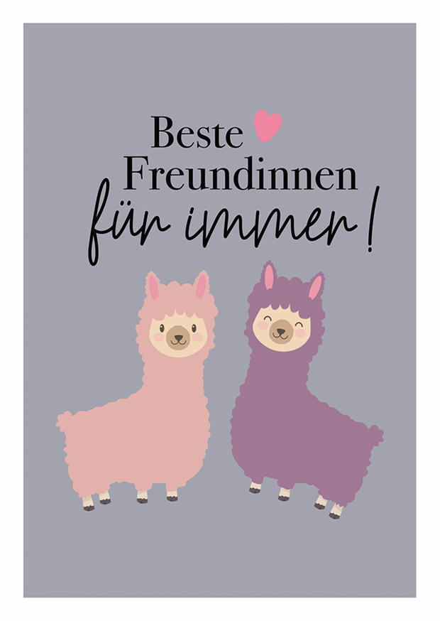 Zwei niedliche Alpakas in pink und lila lächeln freundlich auf einem grauen Hintergrund, begleitet von der inspirierenden Botschaft beste Freundinnen für immer.