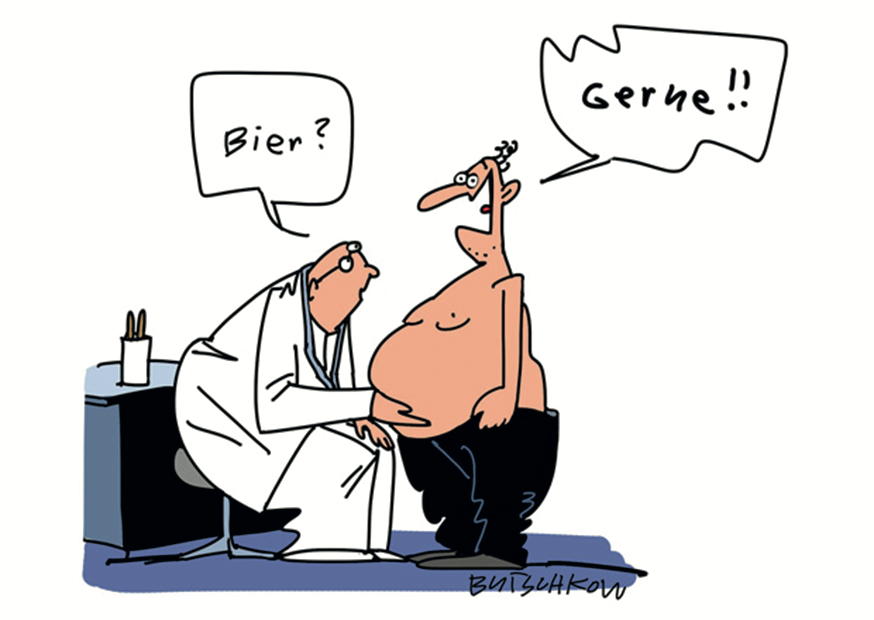 Ein Arzt diskutiert freundlich mit einem Patienten über den Konsum von Bier. Der Patient zeigt sein Bauchspeck, während sie einen humorvollen Moment teilen.