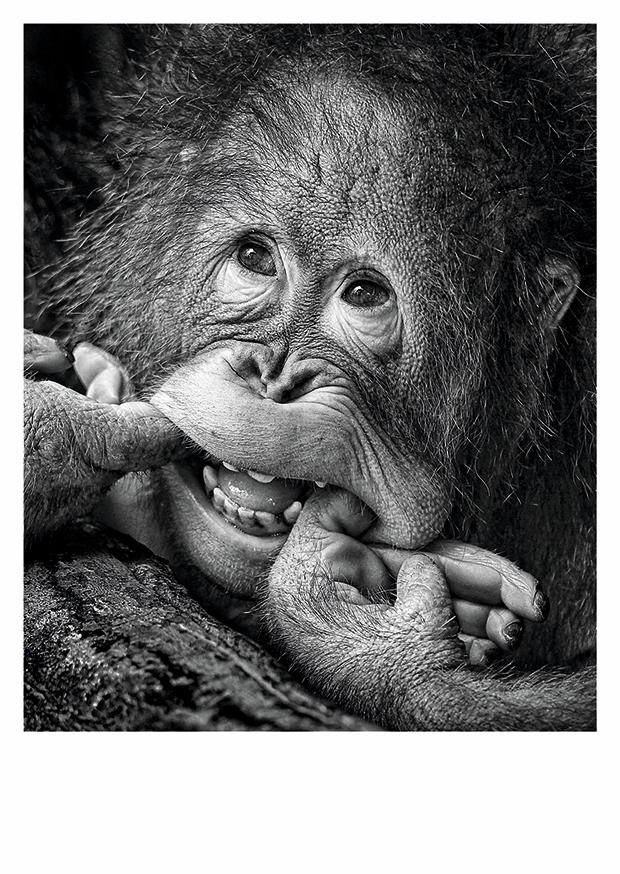 Ein Orang-Utan hält seine Hände und zeigt ein verspieltes Verhalten in seinem natürlichen Lebensraum. Der Dschungel um ihn herum vermittelt ein Gefühl von Freiheit und Abenteuer.