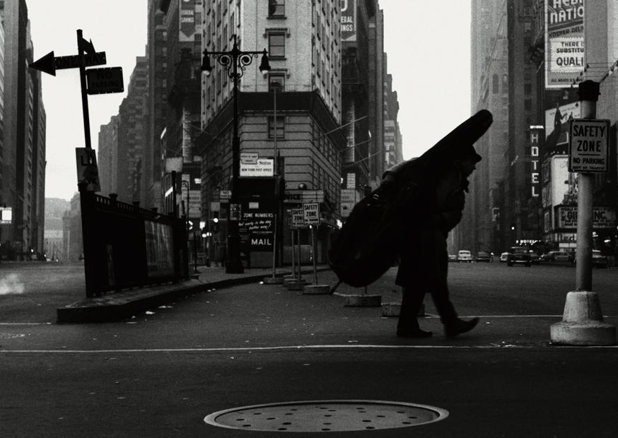 In der Dämmerung geht eine Person mit einer Gitarre durch eine belebte Straße in New York, umgeben von hohen Gebäuden und Verkehrszeichen, die eine melancholische Stimmung erzeugen.