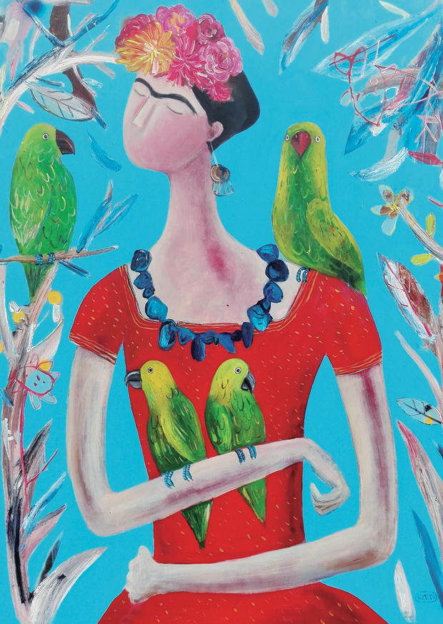 Eine Frau in einem roten Kleid hält mehrere Papageien auf ihren Armen, umgeben von buntem Grün und einem klaren blauen Himmel. Ein fantasievoller und lebendiger Eindruck entsteht.