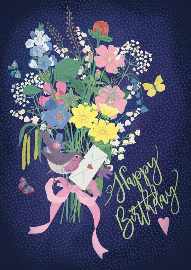 Ein wunderschöner Strauß aus verschiedenen Blumen in lebhaften Farben, umgeben von Schmetterlingen und einer Botschaft zum Geburtstag. Der Hintergrund ist dunkel und elegant.