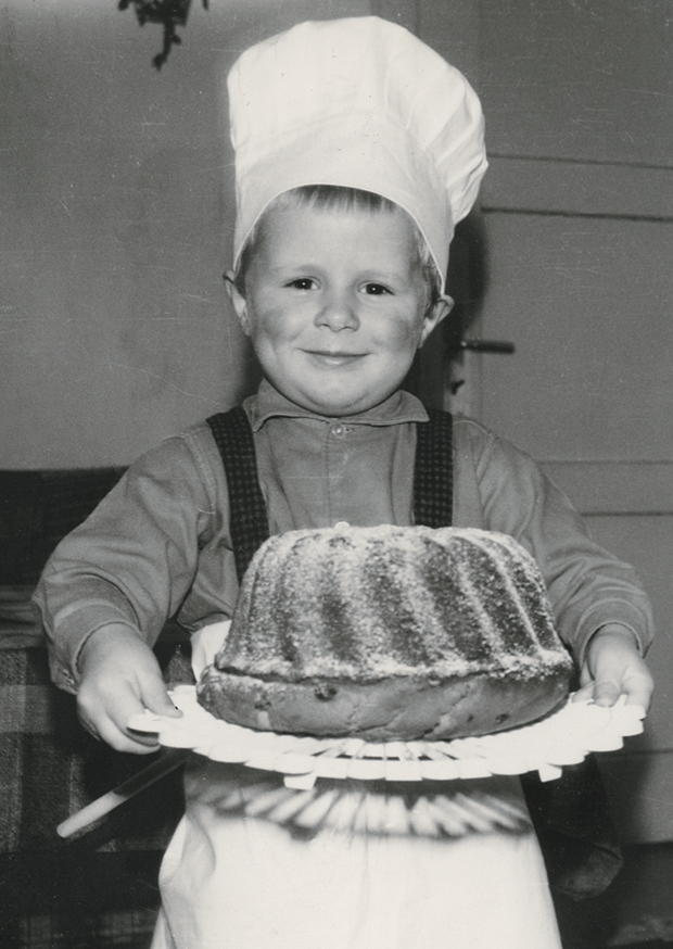 Ein Junge mit einer Kochmütze präsentiert stolz einen großen Kuchen auf einem Tablett. Die Umgebung ist heimelig und versprüht einen nostalgischen Charme aus vergangenen Zeiten.