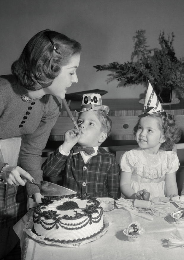 Eine Mutter serviert Kuchen und feiert mit ihrem Sohn und einer Tochter ihren Geburtstag. Alle tragen Partyhüte und genießen die festliche Stimmung.