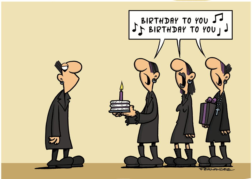 Drei Trauergäste überraschen einen Mann mit einem Geburtstagskuchen, während sie ihm das klassische Lied vorsingen. Ihre schwarze Kleidung sorgt für einen skurrilen Kontrast.
