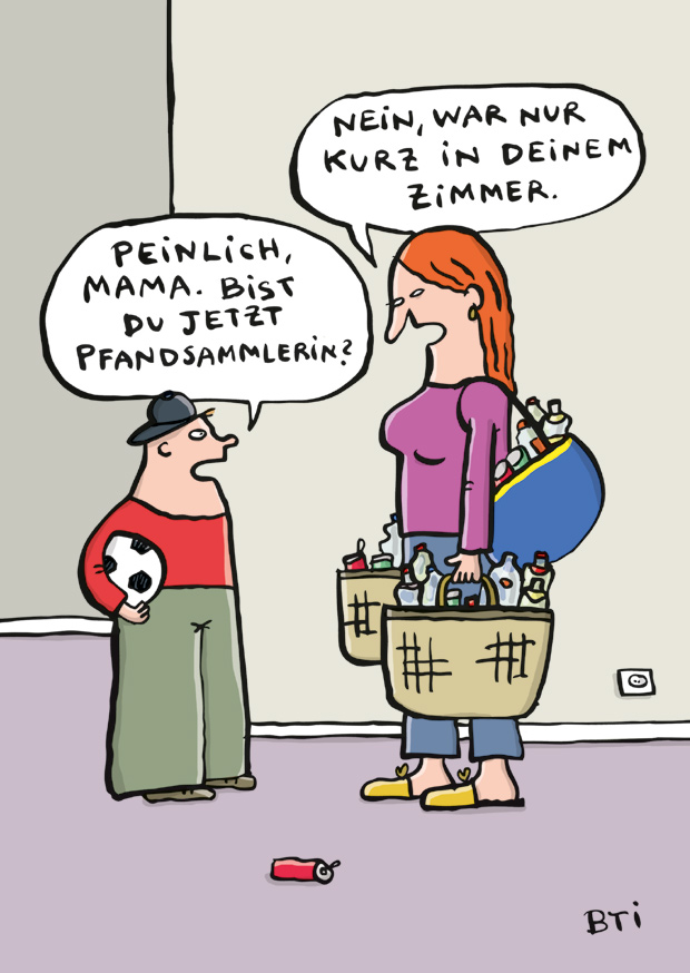 Ein Kind steht mit einem Fußball vor seiner Mutter, die mit zwei Körben voller Flaschen und Dosen steht. Das Kind ist überrascht über die neue Aufgabe der Mutter.