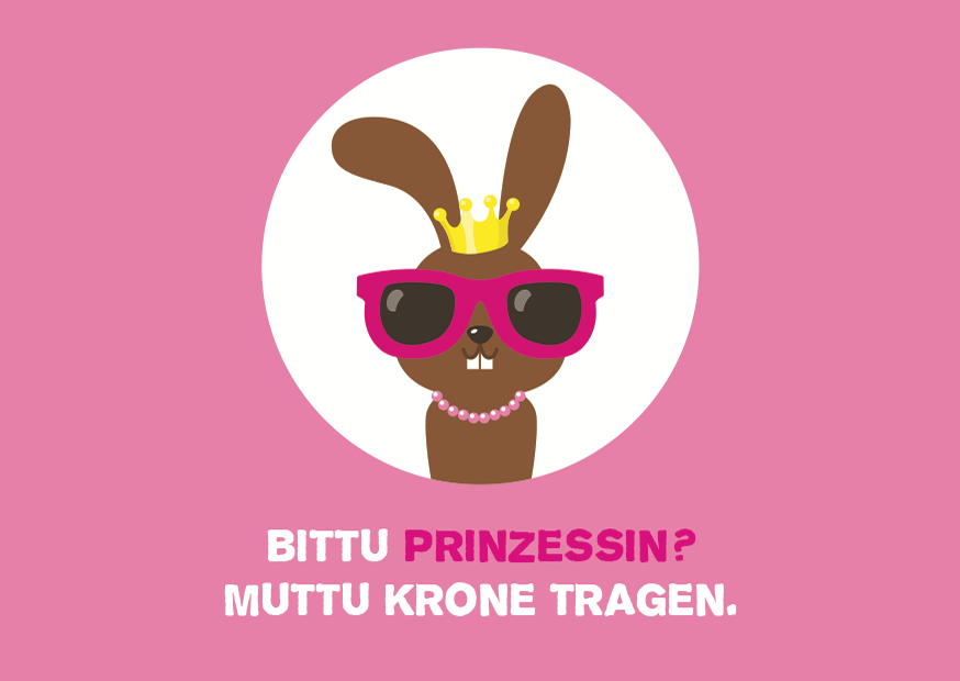 Das Kaninchen trägt eine glänzende Krone und farbenfrohe Sonnenbrille, während es eine humorvolle Anspielung auf das Prinzessin-Sein macht und den Betrachter anspricht.
