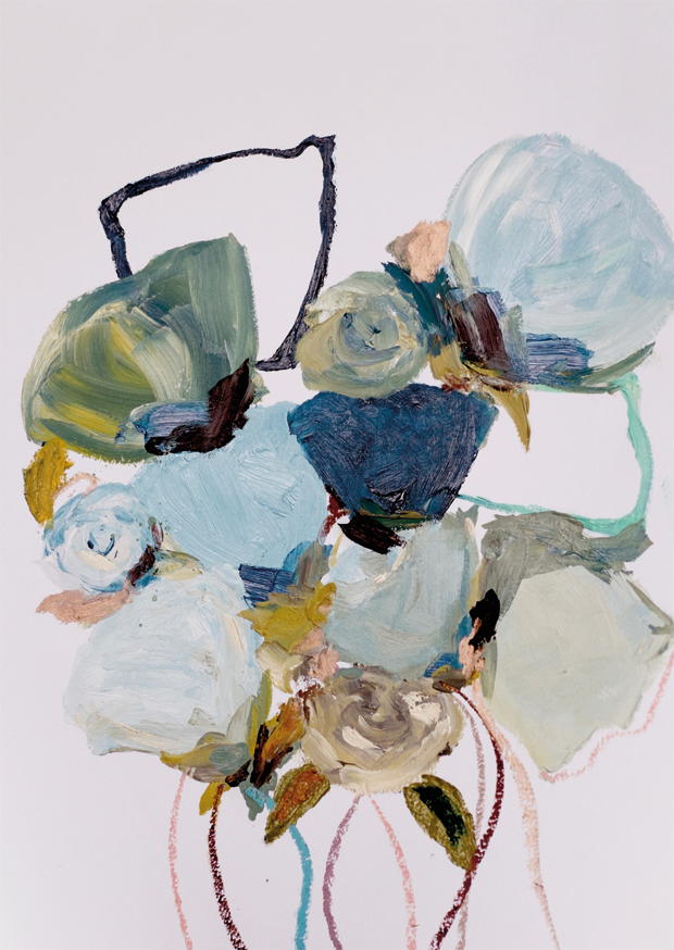 Diese Kunstwerke zeigen eine bunte Anordnung von Blumen in sanften Tönen, die in einem abstrakten Stil auf einem weißen Hintergrund gestaltet sind. Die Farben harmonieren miteinander.