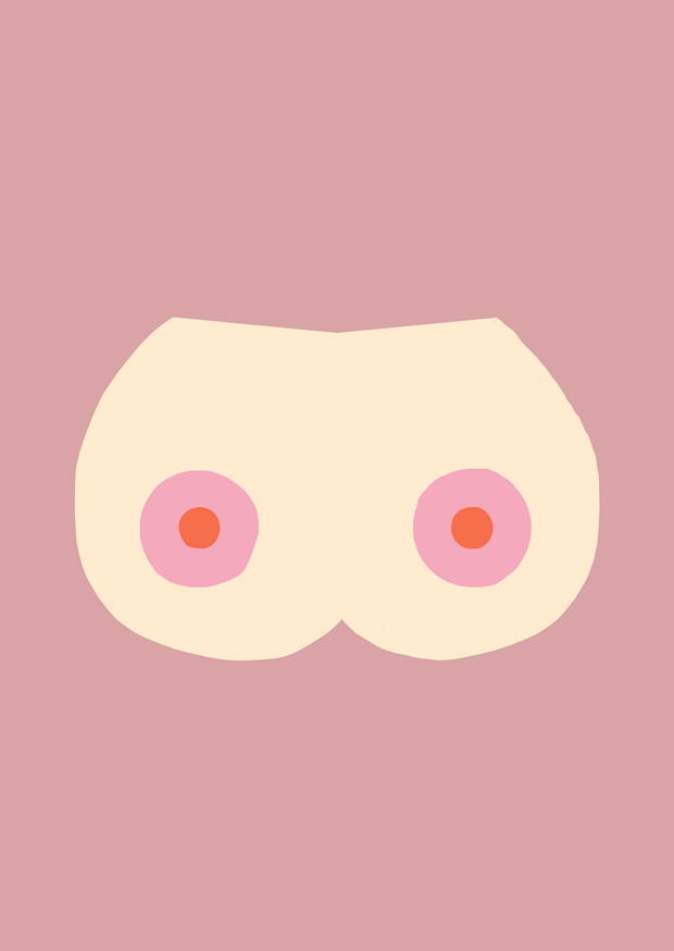 Diese kreative Illustration zeigt eine reduzierte Form von Brüsten auf einem pastelrosa Hintergrund. Die Farben sind weich und harmonisch, was eine beruhigende Atmosphäre schafft.