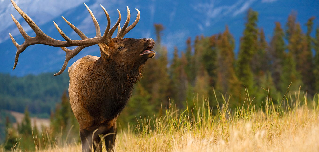 Der Elch mit beeindruckenden Geweih zeigt sein prächtiges Gefieder. Die sanfte Brise bewegt das Gras, während die Landschaft ruhig und malerisch bleibt.