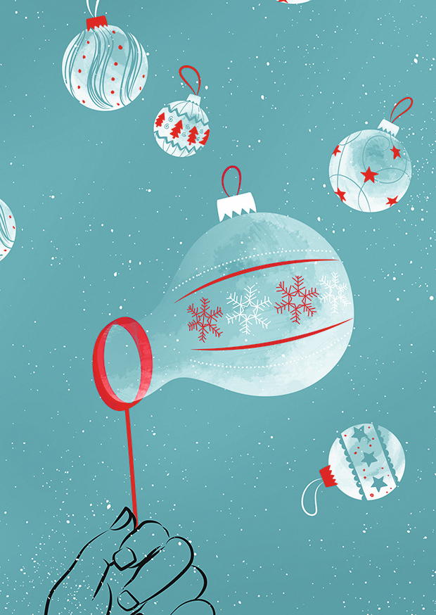 Eine Hand hält eine rote Schleife, während mehrere Weihnachtsbaumkugeln in verschiedenen Farben und Mustern im blauen Hintergrund schweben. Die festliche Stimmung ist spürbar.