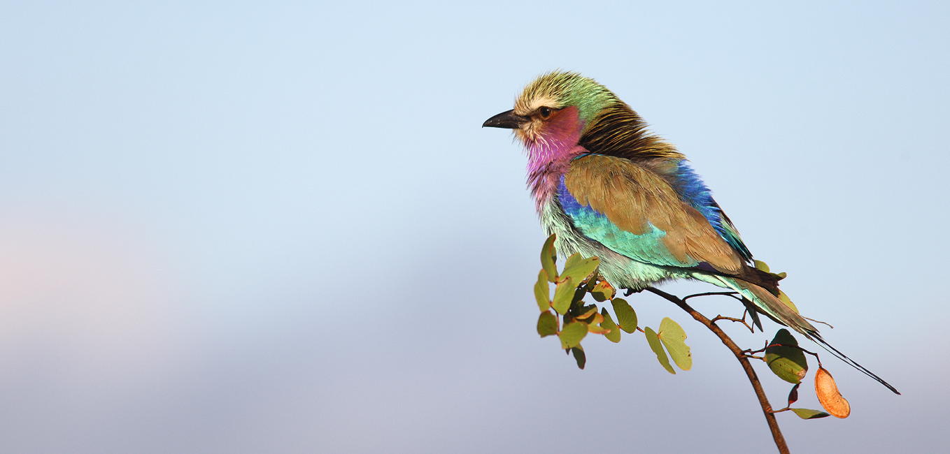 Ein farbenfroher Vogel mit leuchtenden Federn genießt die Morgenstimmung in der Savanne, während er auf einem schmalen Ast sitzt und die Umgebung beobachtet.