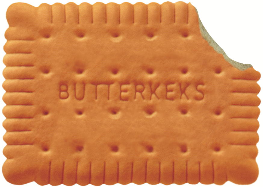Der Keks hat eine goldbraune Farbe und die Aufschrift BUTTERKEXS, mit einem Biss auf der rechten Seite. Perfekt zum Genießen mit Kaffee oder Tee.