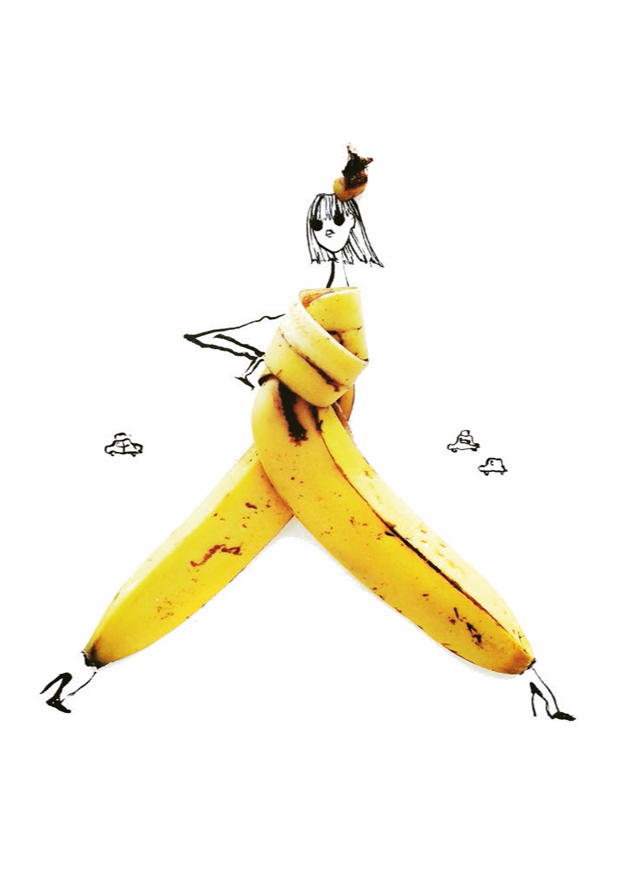 Eine künstlerische Darstellung zeigt eine stilisierte Tänzerin, die aus zwei Bananen geformt ist, mit einer charmanten Frisur, die den Eindruck von Bewegung vermittelt.