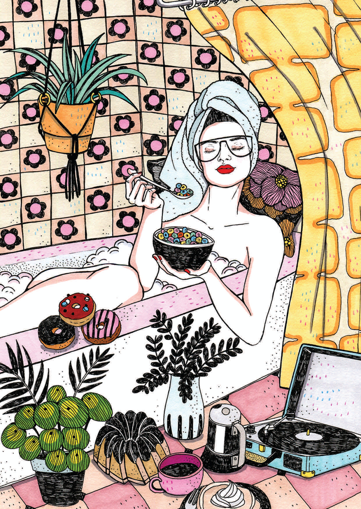 In einem stilvollen Badezimmer sitzt eine Person in der Badewanne und genießt entspannt eine Schüssel Müsli. Um sie herum sind Pflanzen und köstliche Snacks.