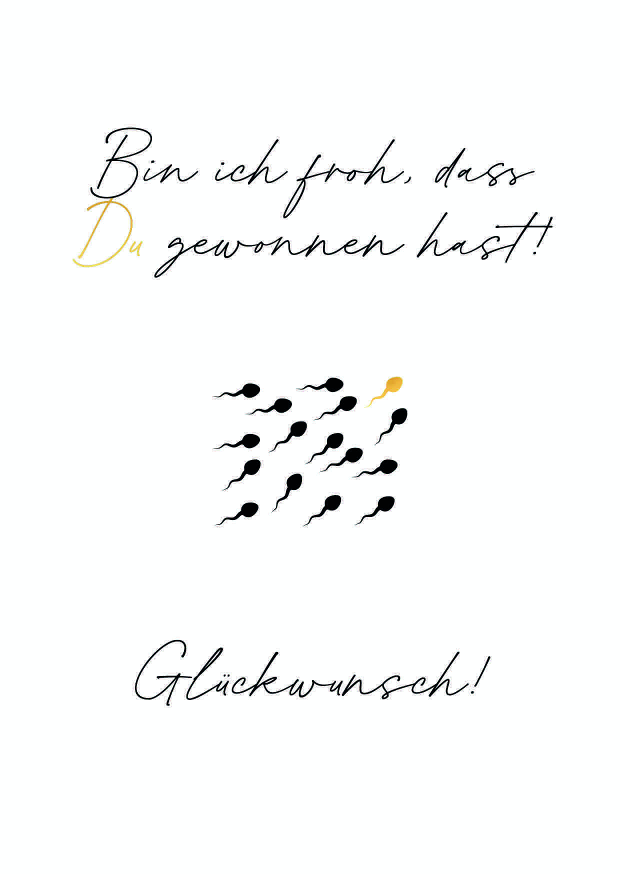Eine kreative Karte zur Gratulation, die eine humorvolle Darstellung von Spermien zeigt, begleitet von einer herzlichen Botschaft zur Schwangerschaft für werdende Eltern.