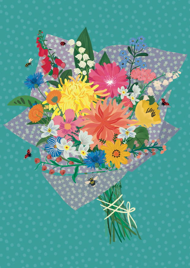 Ein farbenfroher Blumenstrauß mit einer Vielzahl von Blumen, darunter Lilien, Gänseblümchen und Sonnenblumen, auf einem hellen, punktierten Hintergrund.