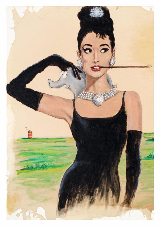 Die stilvoll gekleidete Frau trägt einen langen, schwarzen Abendkleid und hält einen kleinen, grauen Elefanten in der Hand. Sie scheint in einem entspannten Moment zu sein.