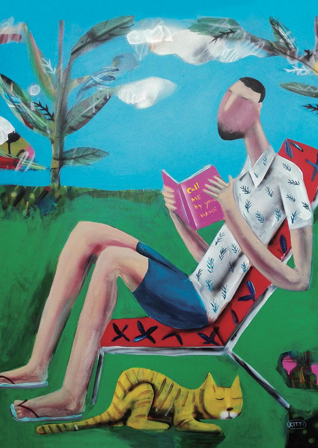 Eine Person sitzt auf einer Liege im Freien, liest ein Buch und wird von einer Katze begleitet. Die Umgebung ist grün und einladend.