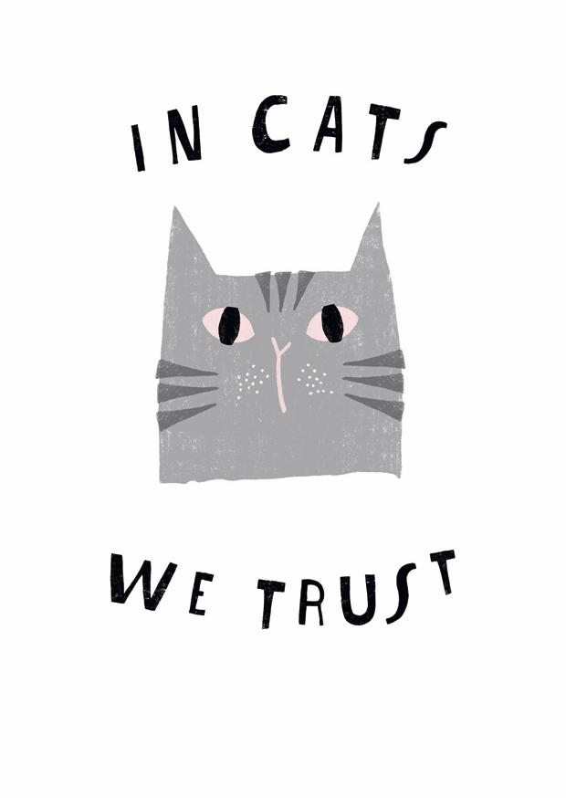 Ein grauer Kater mit markanten Merkmalen schaut direkt mit großen Augen. Um ihn herum steht der humorvolle Spruch „In Cats We Trust“, was Vertrauen in Katzen symbolisiert.