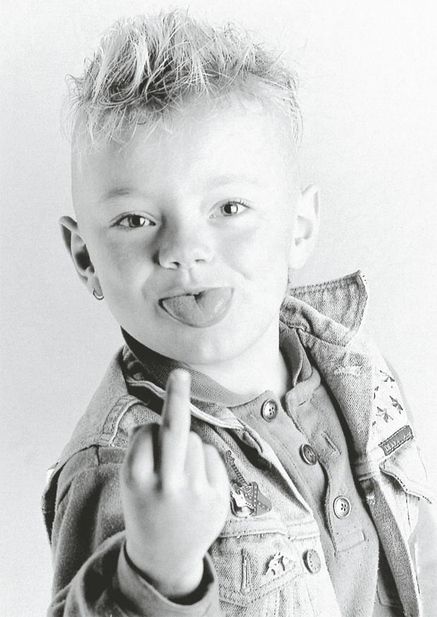 Ein kleiner Junge mit hellen Haaren trägt eine Jeansjacke und zeigt frech den Mittelfinger, während er seine Zunge herausstreckt. Sein Gesichtsausdruck ist voller Lebensfreude.
