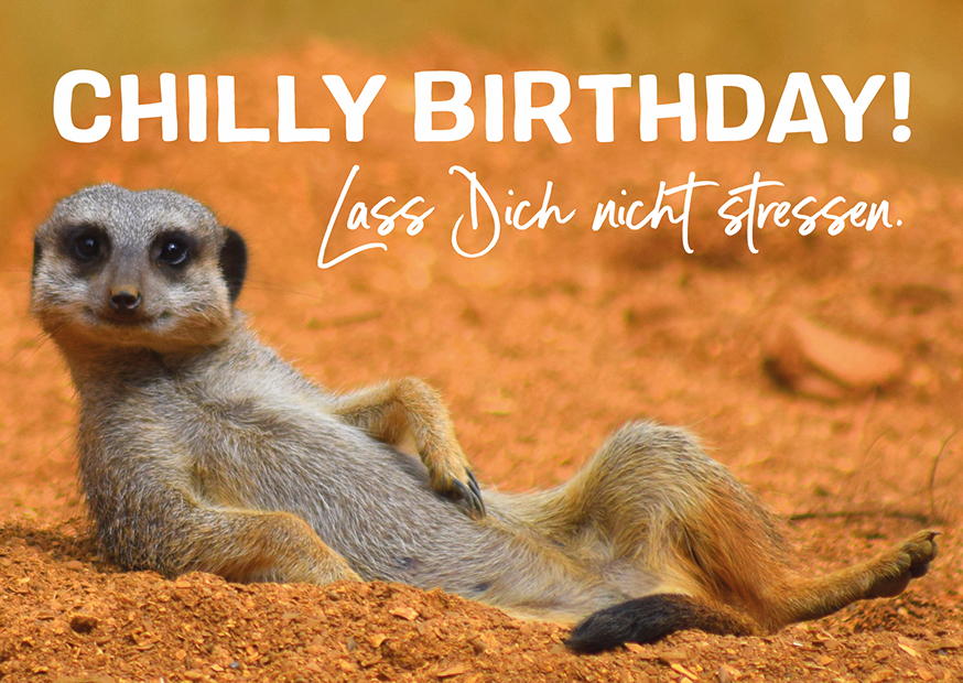 Ein Erdmännchen feiert entspannt seinen Geburtstag in der Wüste. Es lehnt sich zurück, genießt die Sonne und vermittelt eine stressfreie Stimmung.