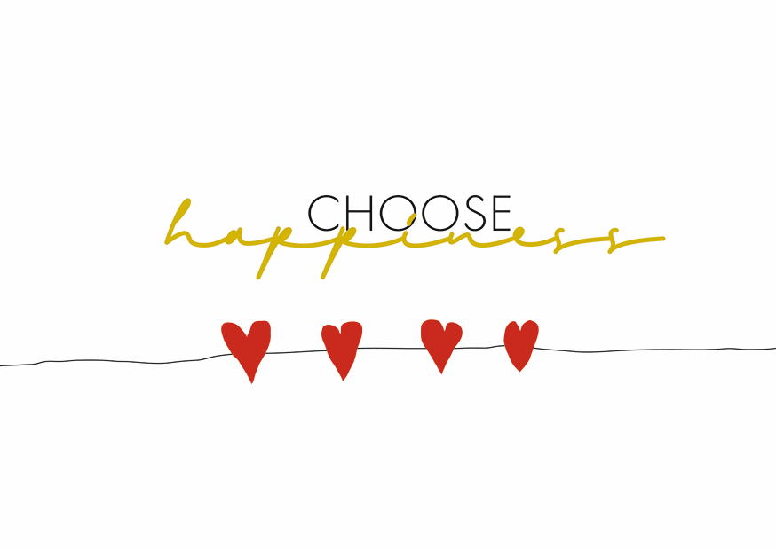 Eine inspirierende Botschaft ermutigt dazu, das Glück zu wählen. Rote Herzen unterstreichen den positiven Gedanken und schaffen eine freundliche Atmosphäre.