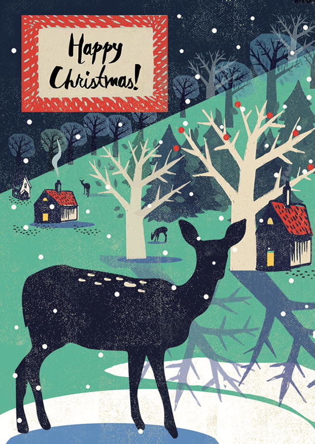 Ein Reh durchstreift eine ruhige, schneebedeckte Landschaft. Vereiste Bäume und kleine, festlich dekorierte Hütten schaffen eine winterliche Atmosphäre.