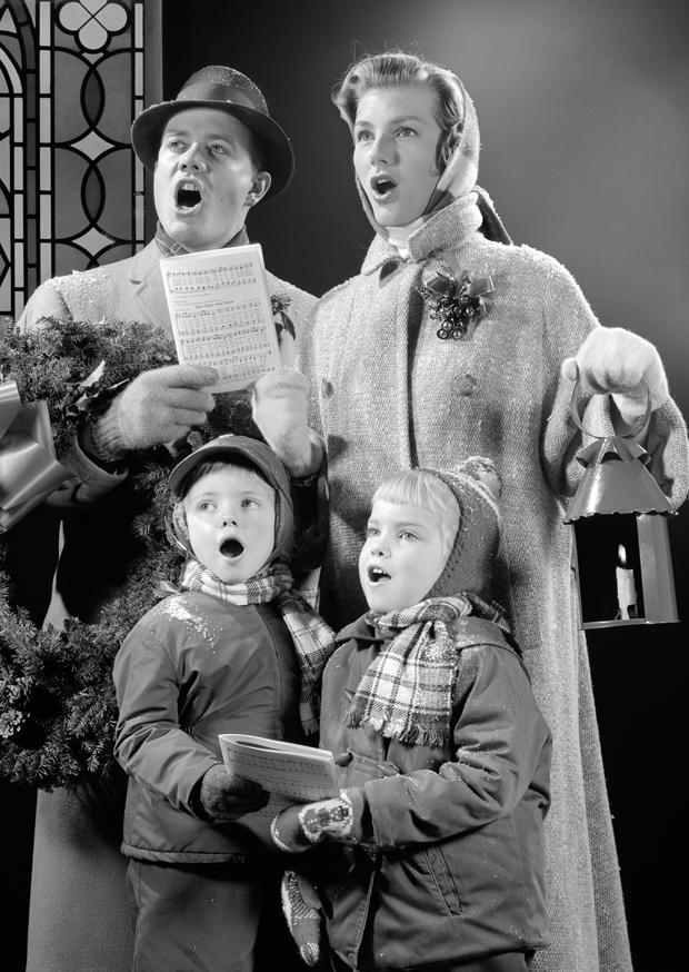 Eine Familie bestehend aus zwei Erwachsenen und zwei Kindern singt fröhlich Weihnachtslieder mit Notenblättern in der Hand. Sie sind festlich gekleidet und umgeben von weihnachtlicher Dekoration.