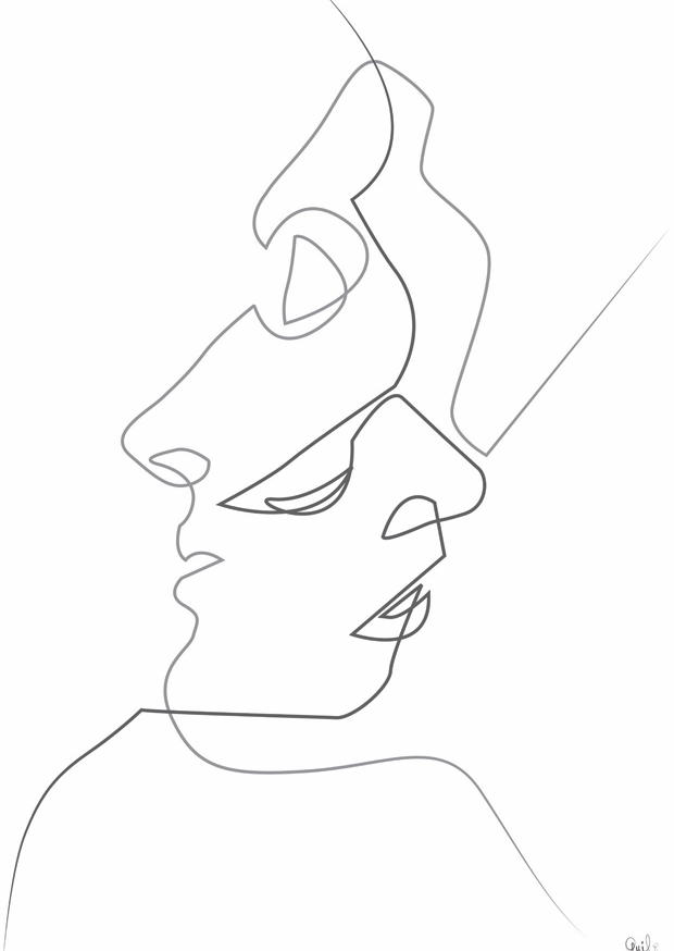 Die Darstellung zeigt zwei miteinander verbundene Profile in einer minimalistischen Linieart. Die eleganten Konturen schaffen eine harmonische Verbindung zwischen den Gesichtern.