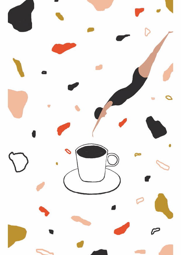 In dieser kreativen Komposition springt eine Schwimmerin in eine Tasse Kaffee, während sie von bunten, abstrakten Formen umgeben ist, die eine verspielte Atmosphäre schaffen.