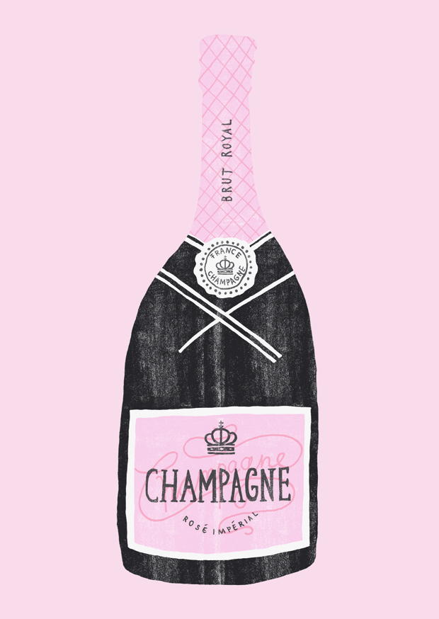 Die Grafik zeigt eine elegante Champagnerflasche mit rosa Etikett und stilvollem Design. Sie wurde vor einem sanften, pastellfarbenen Hintergrund platziert, der den Fokus auf den Inhalt lenkt.