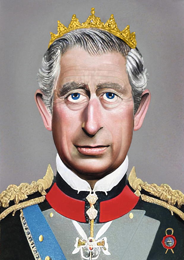 König Charles posiert stolz mit einer goldenen Krone und einer eleganten Militäruniform, die seine Rolle als Monarch symbolisiert. Der Hintergrund ist schlicht und betont seine Ausstrahlung.