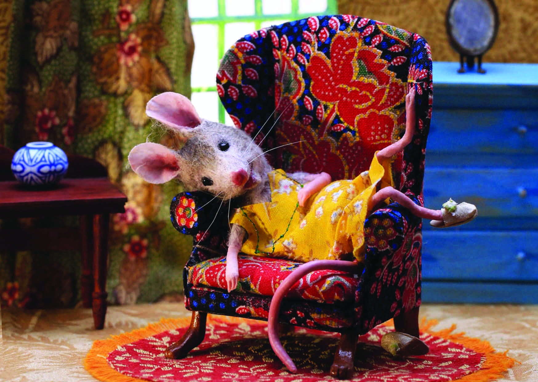 Eine Maus sitzt lässig in einem farbenfrohen Sessel und trägt ein gelbes Kleid. Der Raum ist gemütlich eingerichtet mit einem Teppich und einer Lampe.