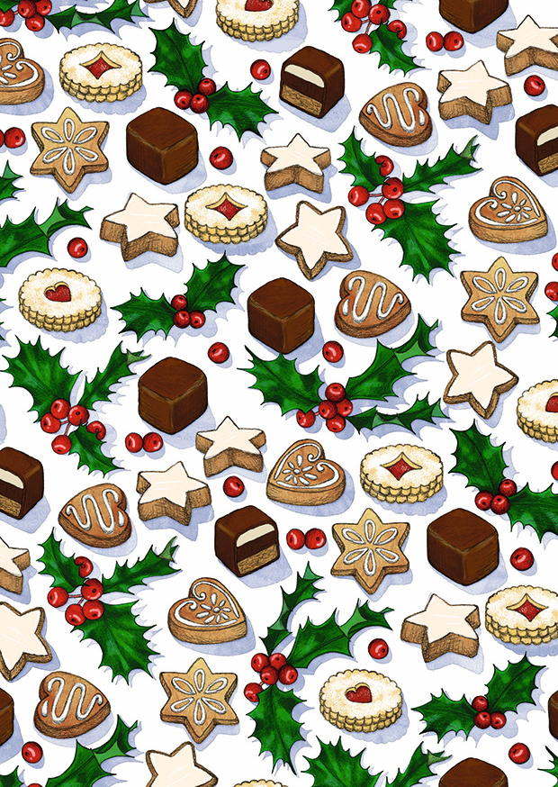 Auf einem weißen Hintergrund liegen verschiedene Weihnachtsplätzchen, umgeben von Tannenzweigen und roten Beeren. Dieseleckeren Leckereien drehen sich um das Fest der Liebe.