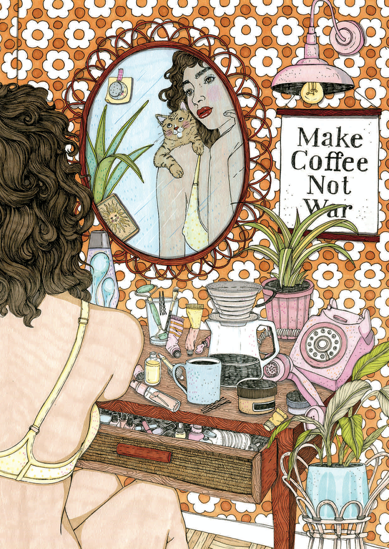 Eine Frau blickt in einen Spiegel und hält eine Katze in den Armen. Der Tisch ist mit Kaffeeutensilien und Pflanzen dekoriert. Das Raumdesign ist bunt und retro.