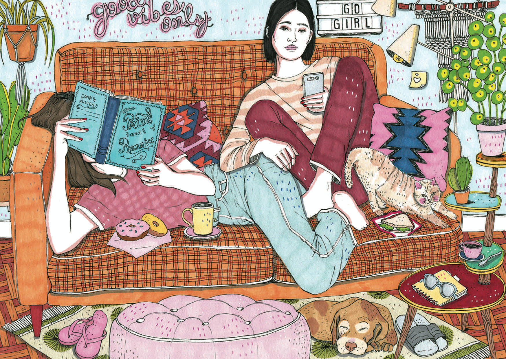 Zwei Freunde entspannen auf einem bunten Sofa, während sie lesen und das Handy nutzen. Ein Hund und eine Katze liegen gemütlich in der Nähe. Snacks und Getränke sind verstreut.