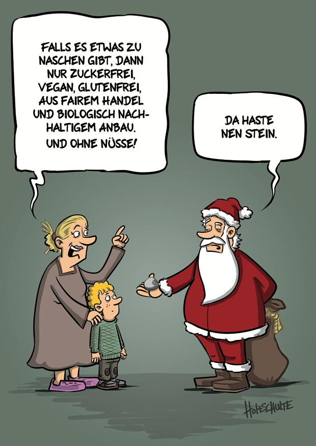 Eine Mutter erklärt ihrem Sohn beim Weihnachtsmann, dass nur gesunde Snacks ohne Nüsse erlaubt sind, während der Weihnachtsmann einen Stein in der Hand hält.