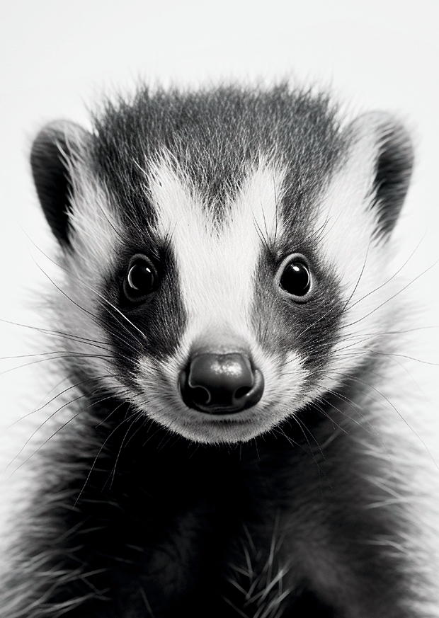Der Dachs zeigt sein niedliches Gesicht mit großen, runden Augen und markanten Streifen, während er neugierig in die Kamera schaut. Die Aufnahme vermittelt einen Eindruck von Neugier und Unschuld.