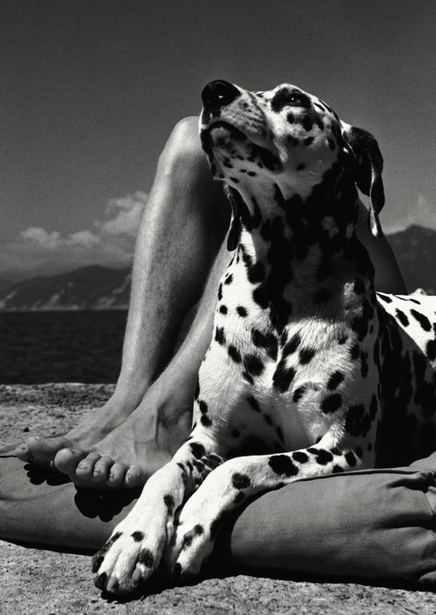 Ein Dalmatiner liegt bequem auf einer Decke, während ein Mann mit baren Füßen entspannt in der Nähe sitzt und die Aussicht auf das Wasser genießt. Es ist ein ruhiger Moment am Strand.